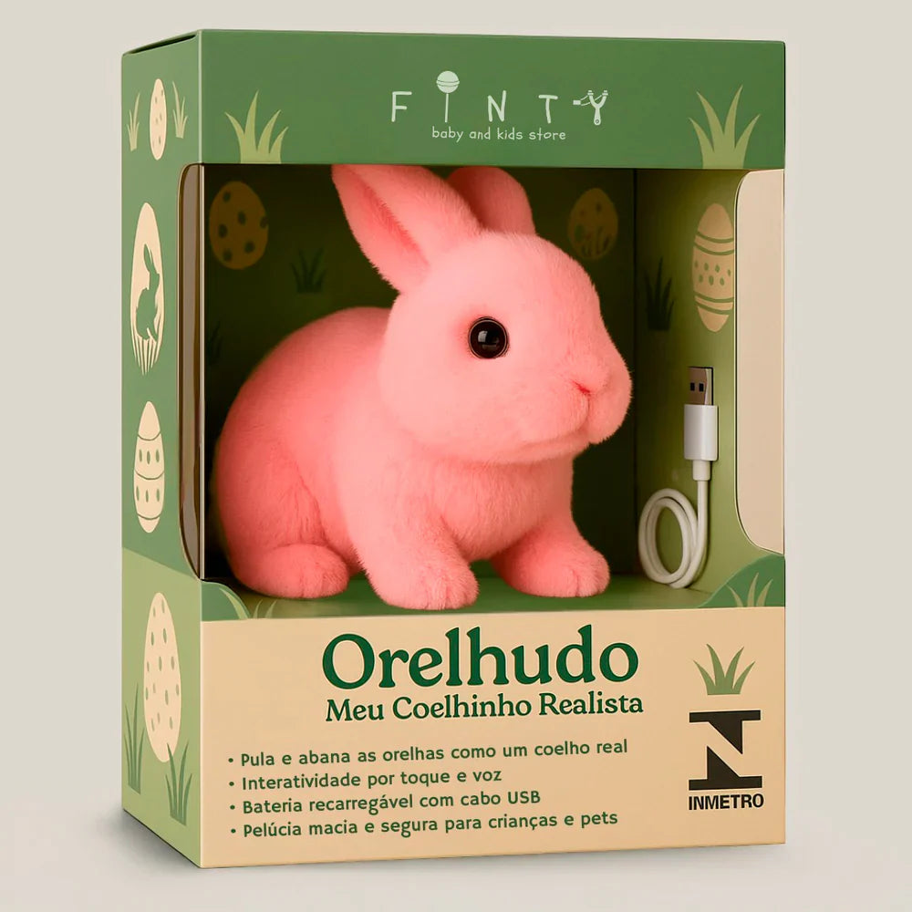 Conheça o Orelhudo, o coelhinho de pelúcia mais realista que você já viu! Ele pula, abana as orelhas e responde ao toque, trazendo diversão sem bagunça para crianças e adultos.